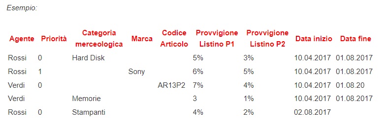 Nel caso si presenti una vendita a listino P1 di un ‘Hard Disk’ di marca ‘Sony’, verrà applicata la provvigione con priorità “0”, cioè il 5%.