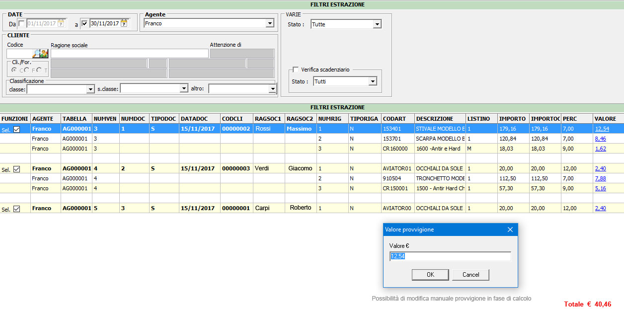 Agli agenti verranno assegnati i clienti corrispondenti e sulle vendite fatte da quest’ultimi il sistema estrarrà le provvigioni per :